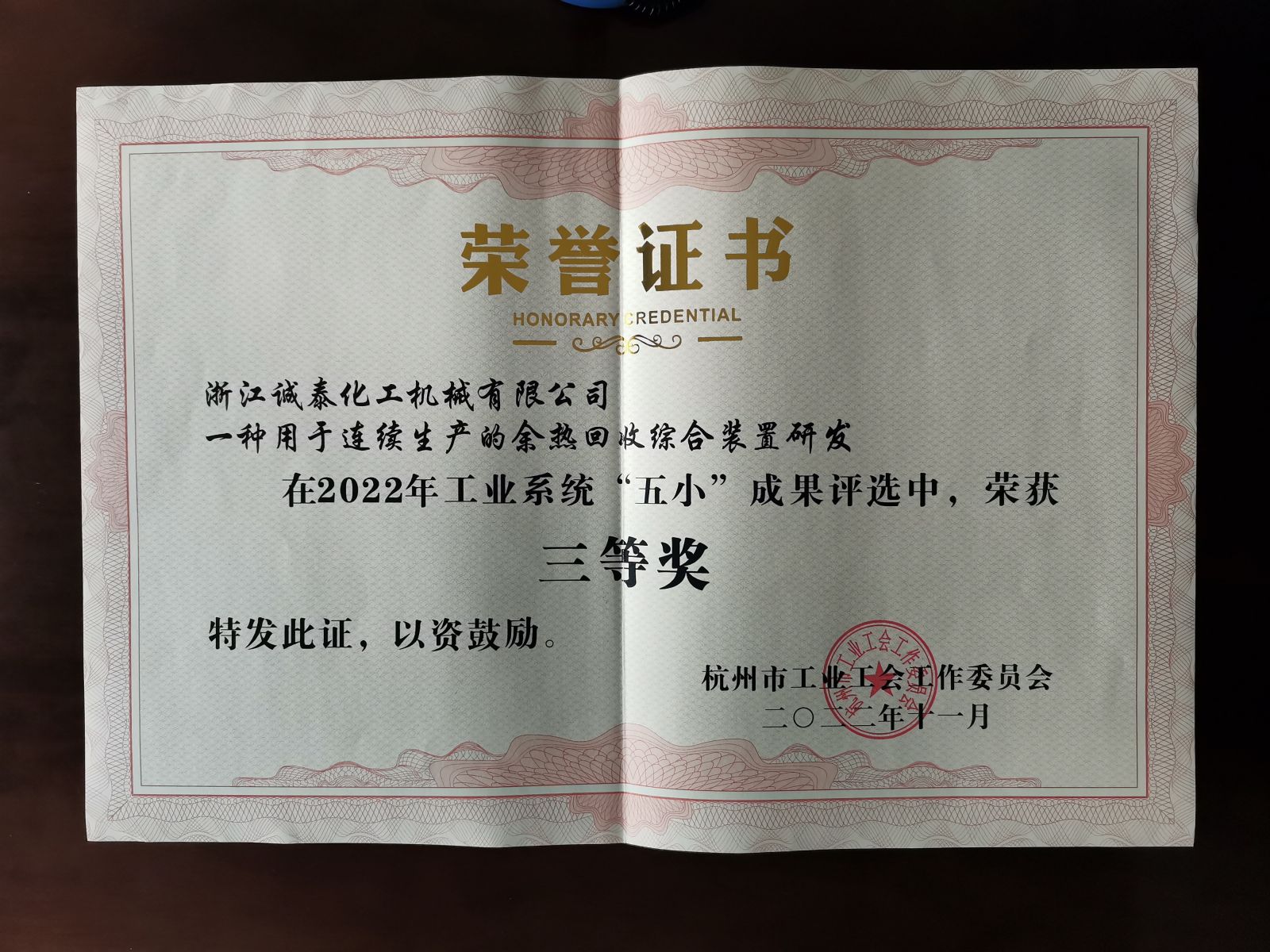 祝賀我公司“一種用于連續(xù)生產(chǎn)的余熱回收綜合裝置研發(fā)”獲得2022年度杭州市工業(yè)工會“五小”成果三等獎; 公司氬弧焊班組獲得2022年度杭州市工業(yè)工會“工人先鋒號”稱號。